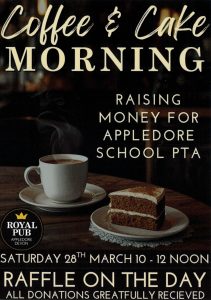 - Coffee, cake and raffle FOAS fundraiser for the school, Saturday 28th March, 10am-12pm, Royal Pub, Appledore