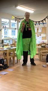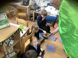 Asda Man came to talk to us about healthy eating. We brought lots of fruit for us to try. We loved the melon and the plums.
