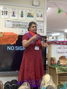 Tilly spoke to us about how she celebrates Diwali. She said that people put out 108 diva lamps around their house! She showed us lots of decorations, clothes and she even taught us a dance.